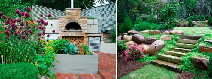 Градинските пътеки ще изглеждат хармонично, ако са направени от камък или дървени стърготини, камъчета или чакъл. Могат да се използват и бетонни плочи с необичайни форми.