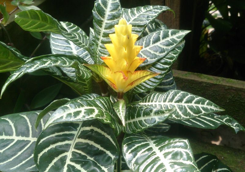 Големите, тъмни, лъскави листа са бодливи или гладки, с широки централни и странични жилки в бежови, сребристи или снежнобели тонове, създавайки уникален модел. Цветовете с твърди, богато оцветени прицветници са разположени на крайни конусовидни или шиповидни венчелистчета. Те имат двуустно венче в нюанси на червеникаво, рижо, жълто или лилаво. Горният лабелум е двузъб, долният - триделен.
