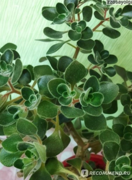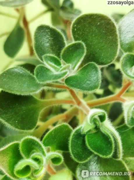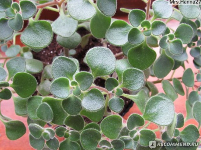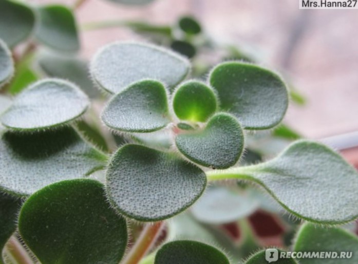 Растението има малки, заоблени, леко окосмени, тъмнозелени листа, обикновено разположени в малки розетки. Ако листата са повредени, растението може да излъчва леко неприятна миризма.