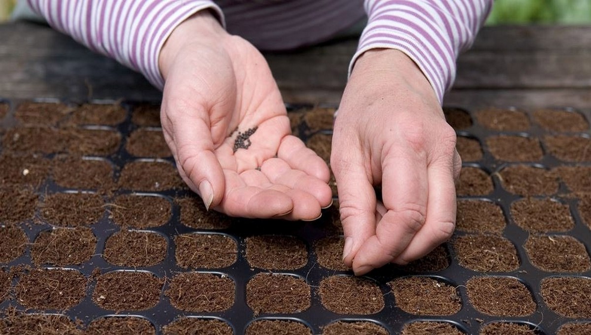 - СеитбаСемената трябва да се засяват във влажна почва в саксии или тави на дълбочина около 1,5–2 см. Кълновете обикновено се появяват в рамките на една седмица след засяването. Когато разсадът достигне етапа на третия истински лист, той може да се пресади в отделни торфени саксии, оставяйки разстояние приблизително 50–60 см между растенията.