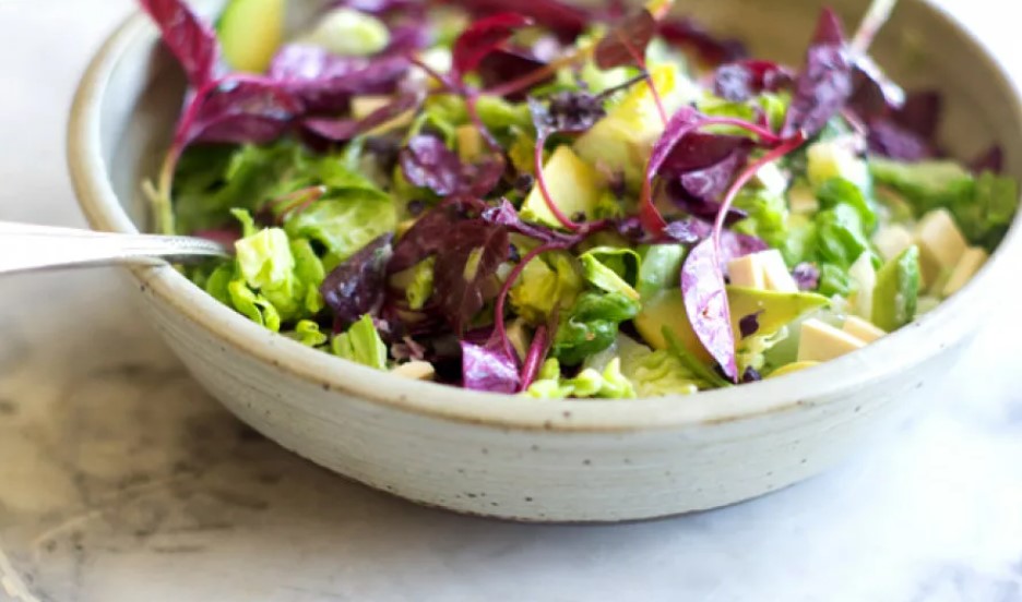 Смесете листата от маруля, китайското зеле, руколата и листата от амарант в купа. Поръсете с лимонов сок и овкусете с растително масло.