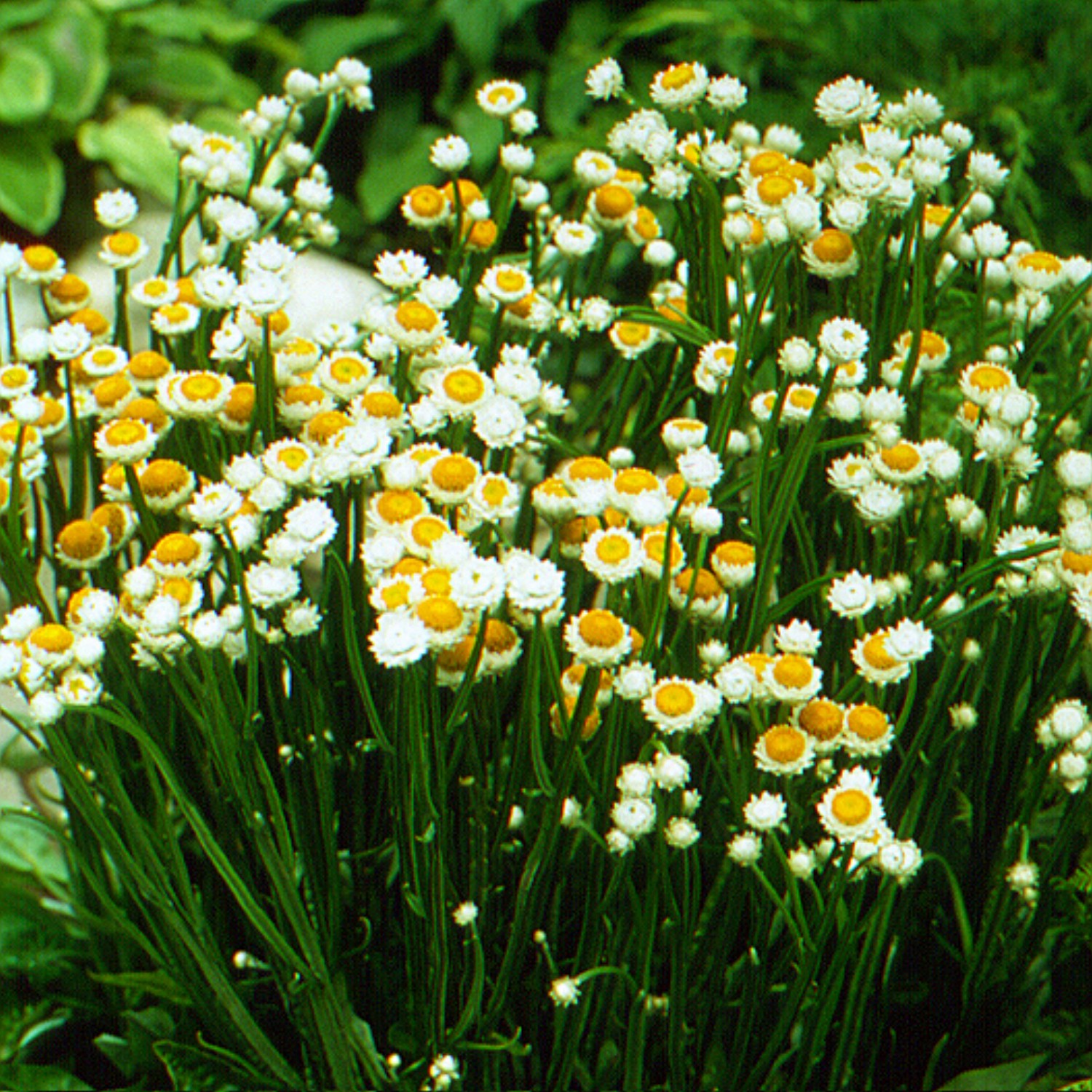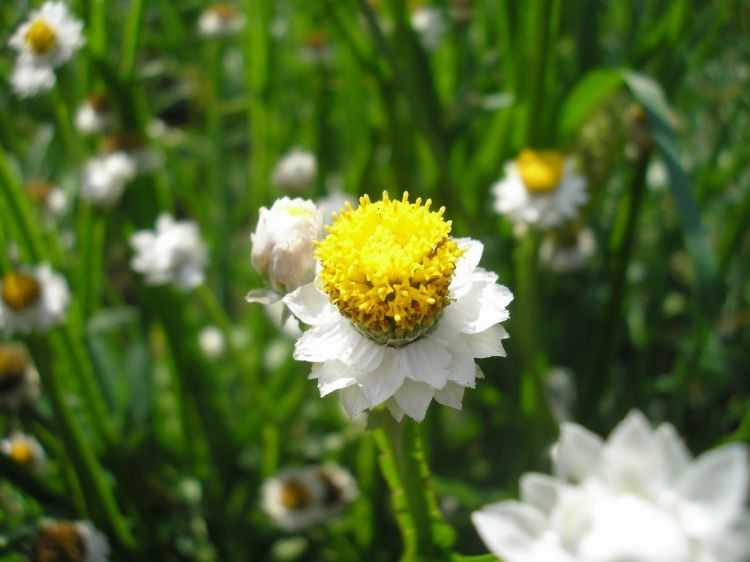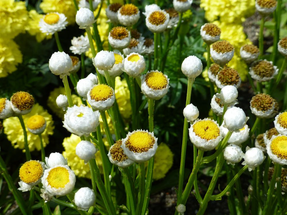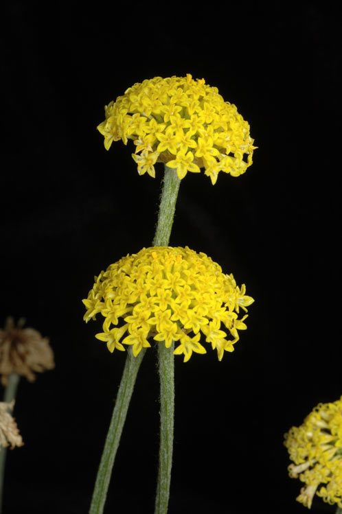 В началото на лятото растението образува дълги, разклонени стъбла. На върховете на тези стъбла се отварят съцветия, съдържащи множество малки, тръбести цветове. Централните цветове са ярко жълти, заобиколени от бели прицветници, създавайки привлекателен контраст.