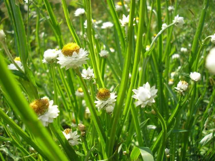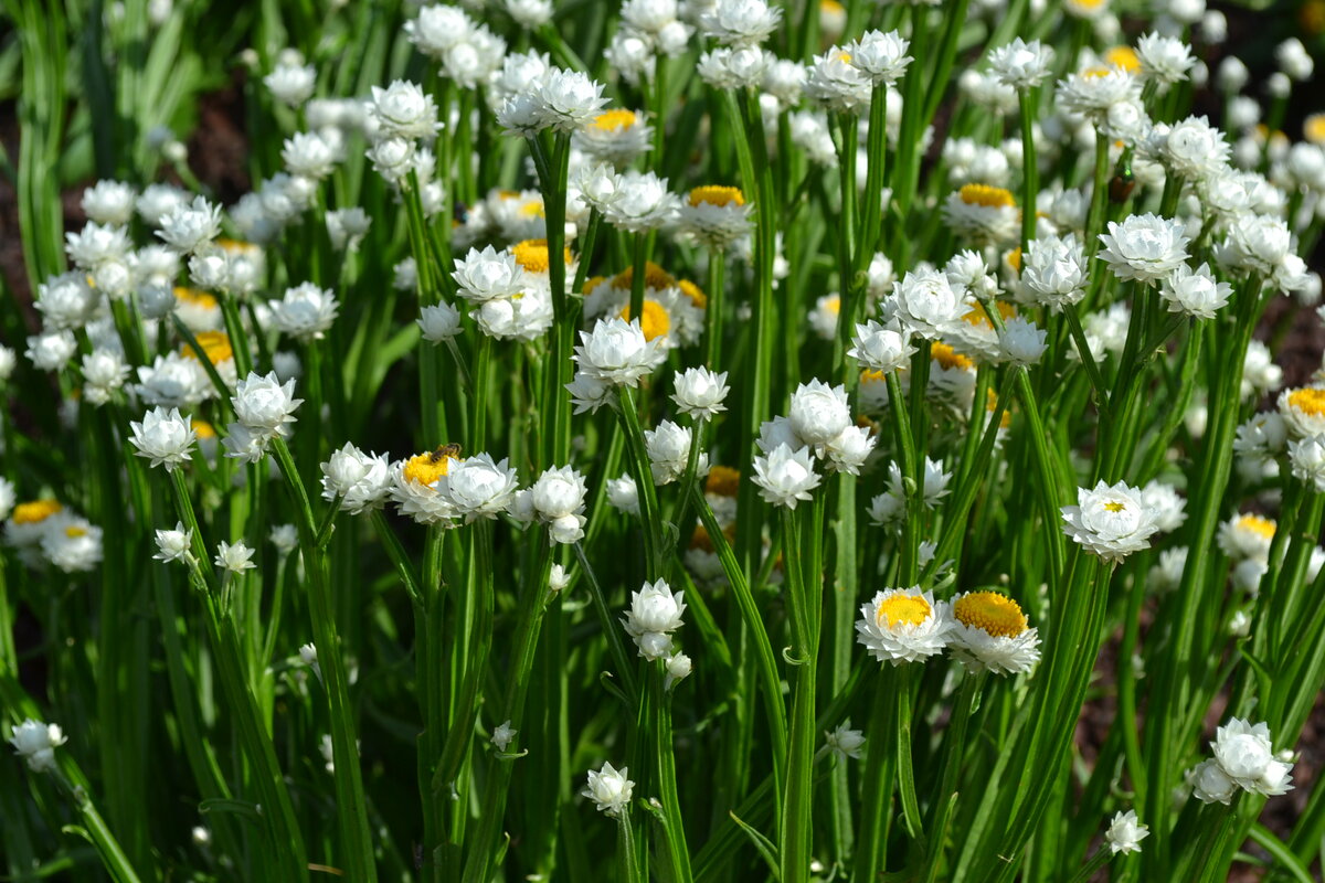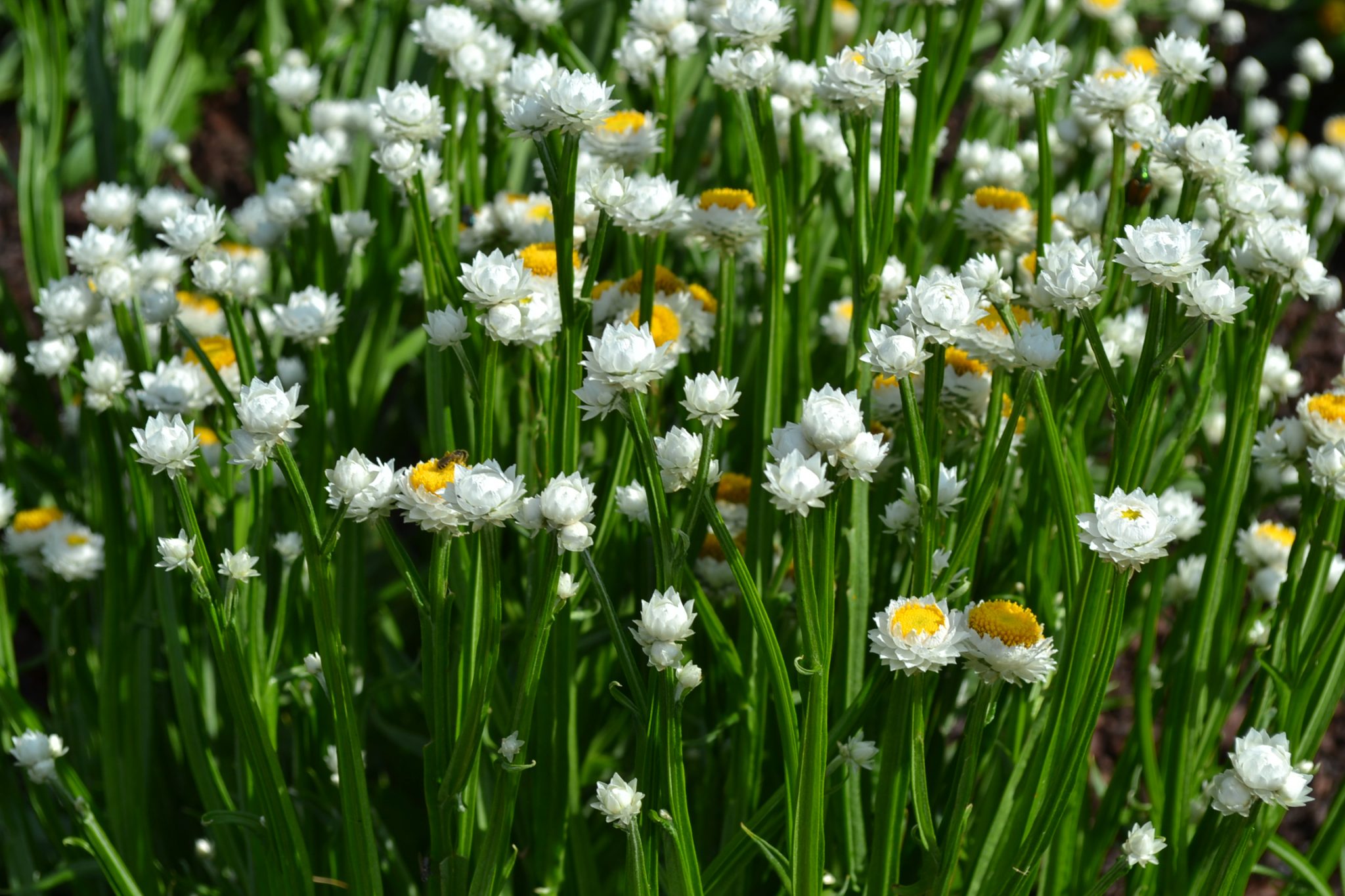 Пролетните цветни главички на този вид са полусферични, копчевидни съцветия с ширина до 10–20 мм. Те са заобиколени от хартиени, листоподобни прицветници. Единичните цветни главички на неразклонени стъбла достигат височина от 30 до 60 см. Съцветията са сламено оцветени, с ярко жълти тръбести цветове вътре.