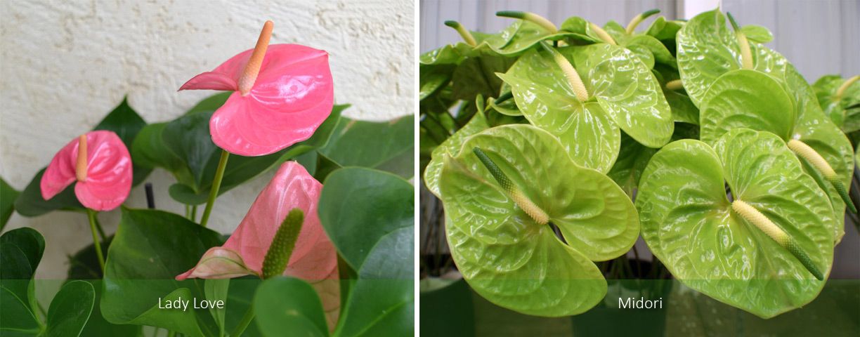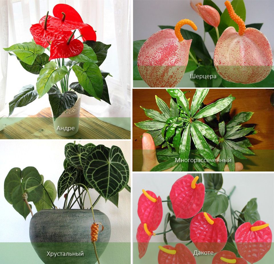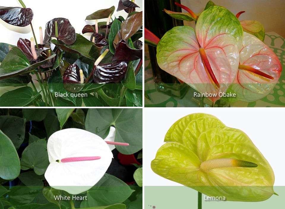 | Андре | Първият култивиран сорт. Отличава се с целогодишния си цъфтеж. | Червено, бяло, лилаво, розово, тъмно бордо. | Ярко, заострено, става зелено след цъфтежа. |