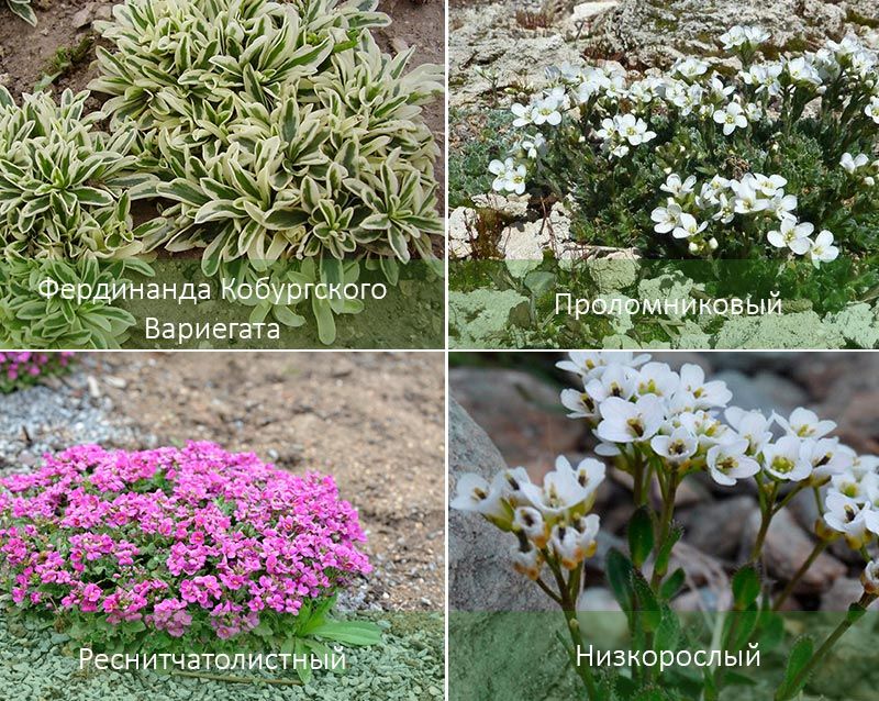 | Фердинанд от Кобург Вариегата (Arabis ferdinandi-coburgii Variegata) | Полувечнозелен храст, с диаметър до 30 см. Цветовете са бели. Цъфтящ дълго време. Понася ниски температури с адекватен дренаж. | 5 | Те не се открояват. | Светлозелени нюанси, оградени с бяло, жълто или розово. Розетките, оформени като обемни възглавници, са ценени. |