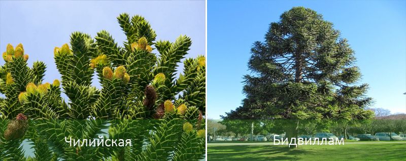 | Чилийска араукария | Височина до 60 м, обиколка около 2 м. Клоните са плътно притиснати един към друг с много твърди, тъмнозелени игловидни листа. Короната е широкопирамидална. |
