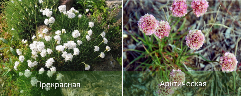 | Красива (псевдоармерия) | Расте до 0,4 м. Периодът на цъфтеж е от юни до август. | Тъмнозелено. | Бяло и розово. |