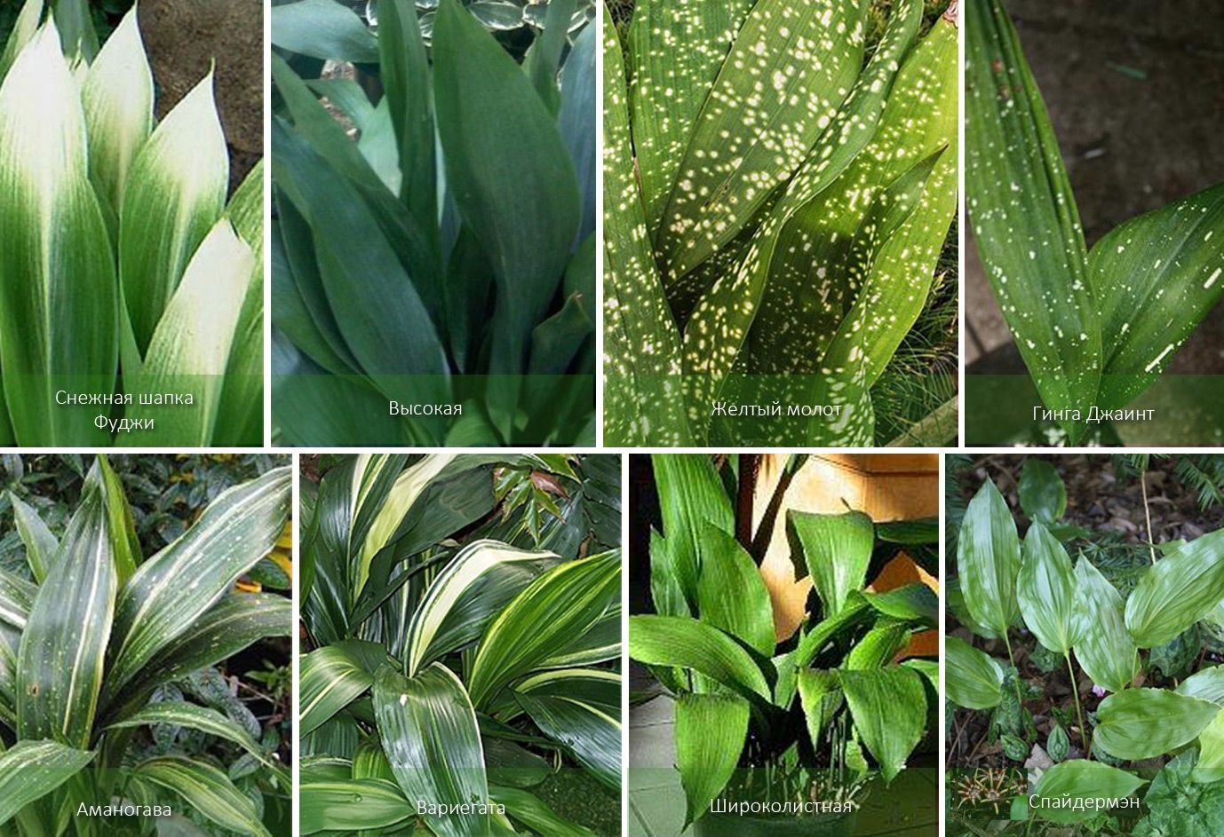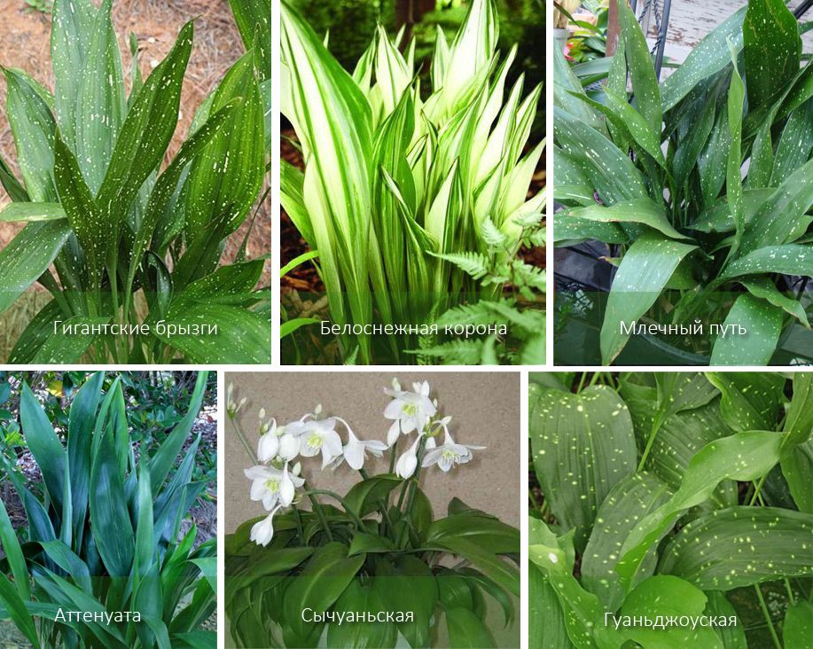 | Млечен път | Големи, тъмнозелени, покрити с бели точки и петна без особена форма. | Това е един от най-известните пъстри сортове Аспидистра. Устойчив е на суша и ниски температури. Цъфтежът се случва в края на зимата до началото на пролетта. Цветовете са единични. |