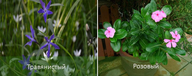 | Розово | Изправен, разклонен храст с височина около 60 см. Листата са тъмнозелени, овални и кожести. Цветовете са изобилни и средно големи, често розово-червени или лилави на цвят; съществуват и едноцветни бели разновидности. | Охладител с грозде, охладител с мента, Първа целувка. | Среща се в Мадагаскар, Индия и Китай, а името му е и Catharanthus. Използва се в народната медицина за лечение на тумори. |