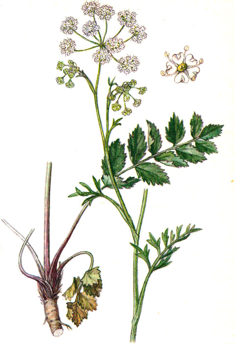| Съединение | Корените съдържат етерично масло, кумарини, умбелиферон, пимпинелин, зобергаптен, смола, захар, танини и др. Миризмата може да бъде остра и неприятна поради наличието на саксазулен в етеричното масло. По време на цъфтежа листата съдържат аскорбинова киселина и каротин. Надземните части са богати на протеини, фибри, калий и калций. |