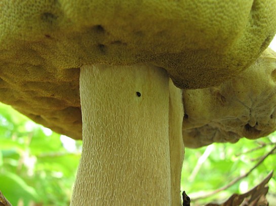 Повърхността на стъблото е бяла, кафява или, по-рядко, червеникава. Може да бъде със същия нюанс като шапката, само че по-светла. Повърхността е покрита с мрежа от белезникави жилки. Това обикновено се намира в горната част, но може да се простира и до долната част.