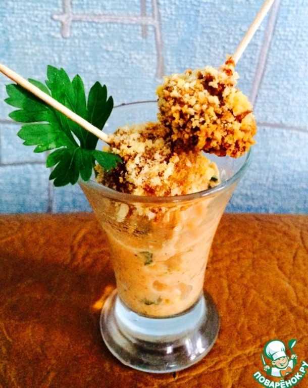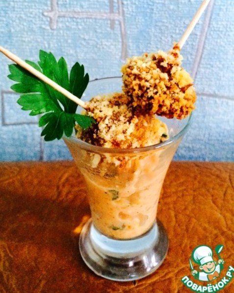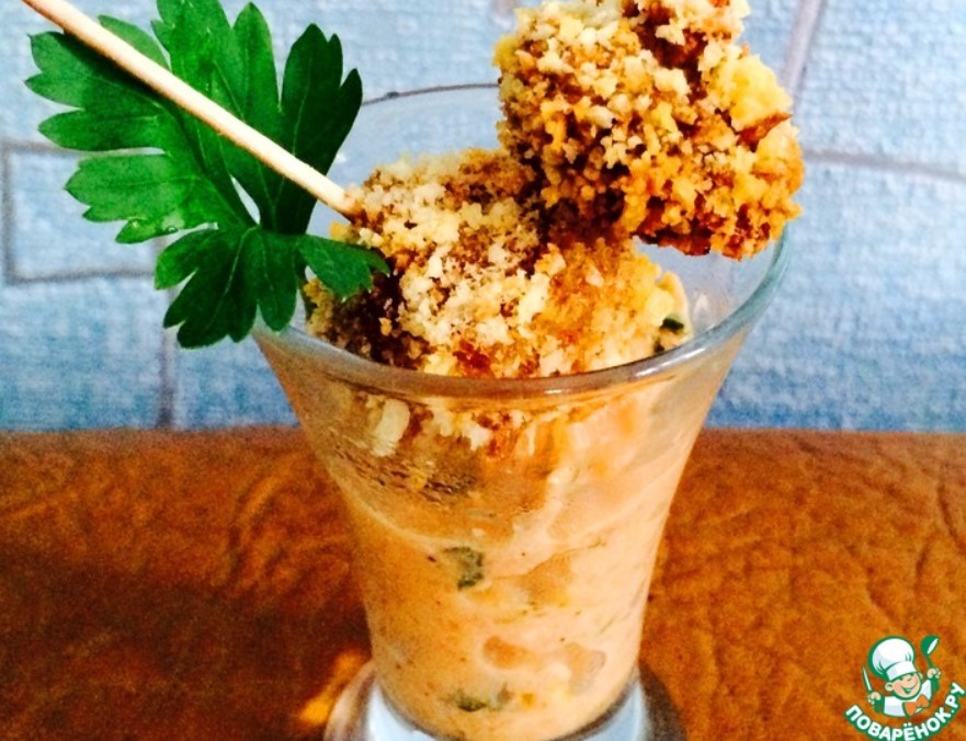 Сервирах го така, със соса в шот чаша. Чисто за украса.А ето още една снимка на гъба в напречно сечение, която показва дебелината на хрупкавата панировка.