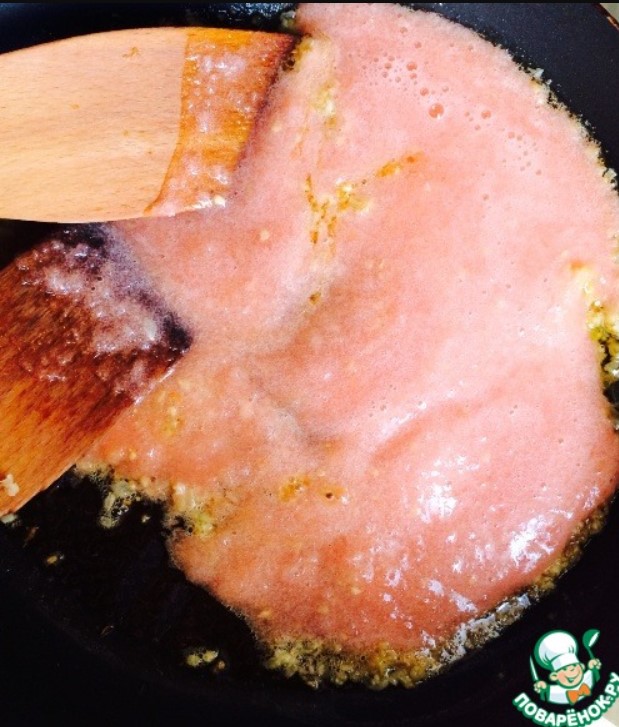 Докато гъбите се пекат, изпълвайки апартамента с вълшебен аромат, нека приготвим соса. Можете да използвате всеки сос, който харесвате, но аз препоръчвам този: обелете доматите и ги пасирайте в блендер. Нарежете ситно лука и го запържете в масло на среден огън до златисто кафяво (около 30 секунди). След това добавете счукания чесън и доматеното пюре от блендера. Подправете с подправки и сол. Оставете да къкри около 3 минути.