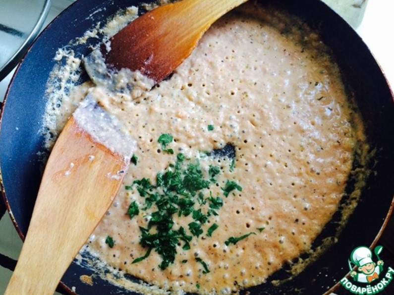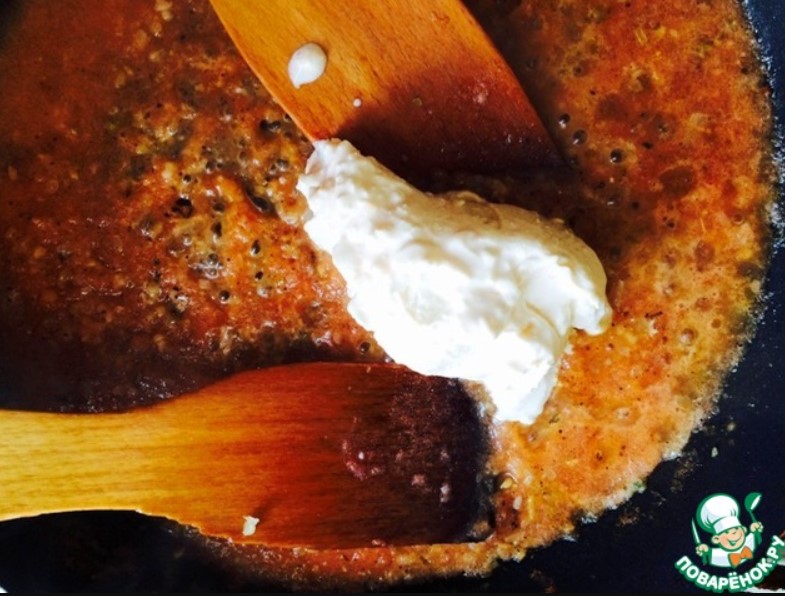 - Изсипете 0,5 чаши заквасена сметана в тигана и оставете да къкри две минути, докато заквасената сметана започне да кипи.
