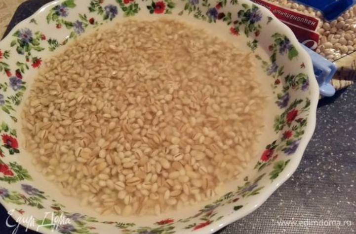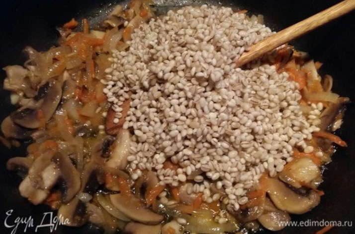Нека задушим перления ечемик с вряща вода, докато зеленчуците и гъбите се пържат.