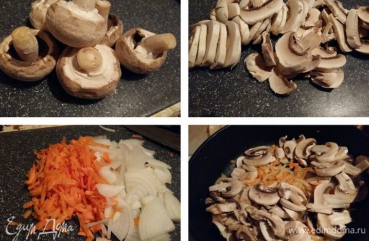 - Нарежете гъбите и лука и запържете в малко количество олио за 10 минути.