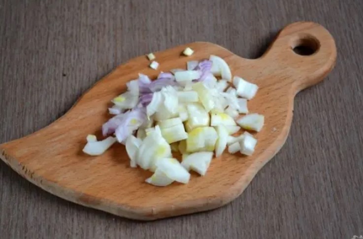 - В тиган запържете нарязания на полукръгчета лук и нарязания чесън до златисто кафяво, след което ги смесете с майонеза.