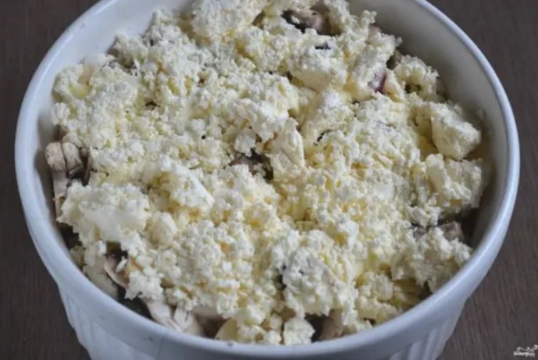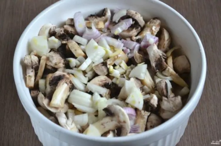 Отгоре сложете нарязани гъби, а върху тях – лука.