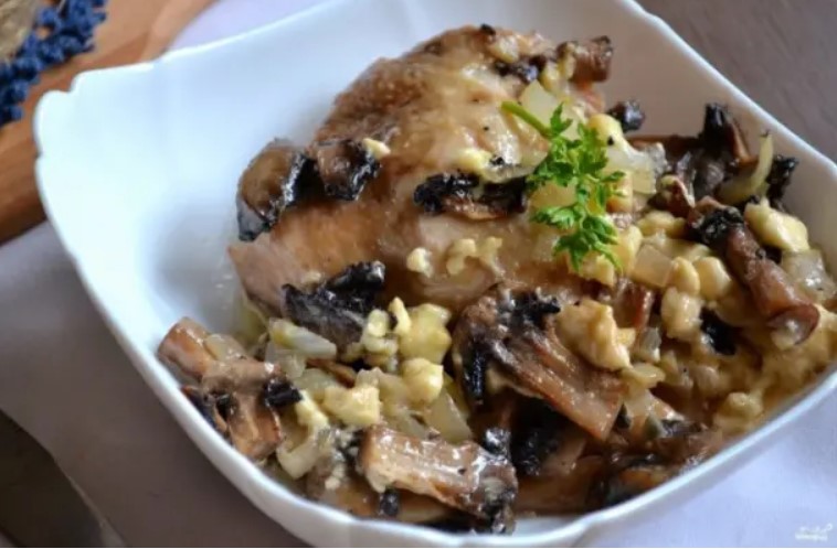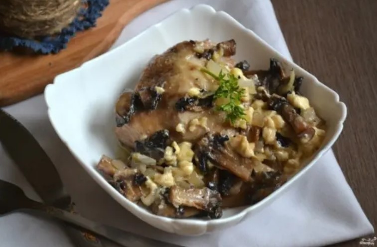 Пиле с гъби във фурната