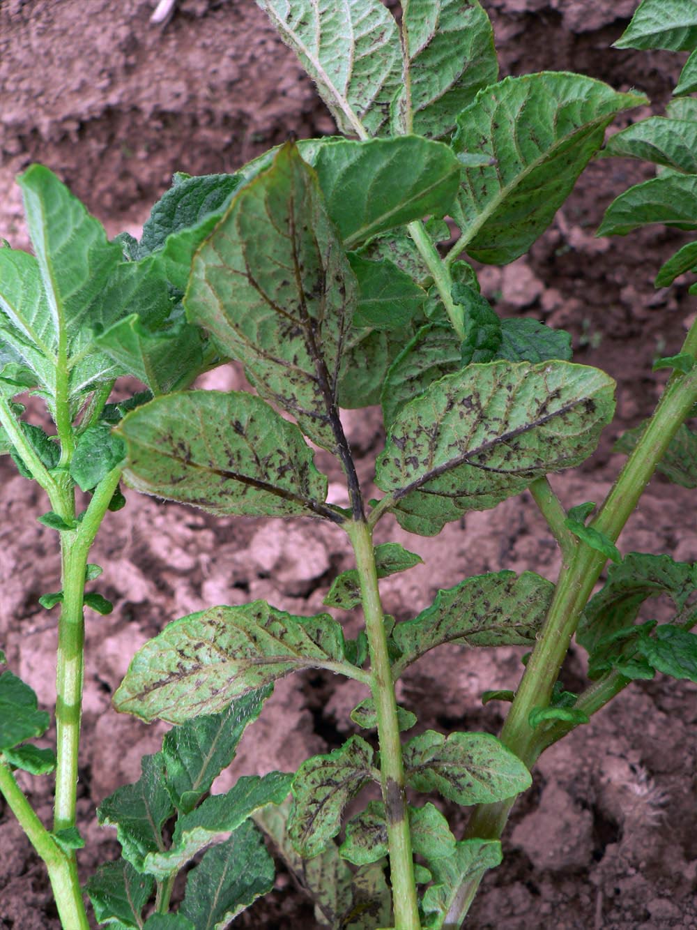 Картофените растения започват да увяхват отгоре надолу. Това се случва по-бързо при горещо време, докато умерените температури и високата влажност забавят разпространението на инфекцията.