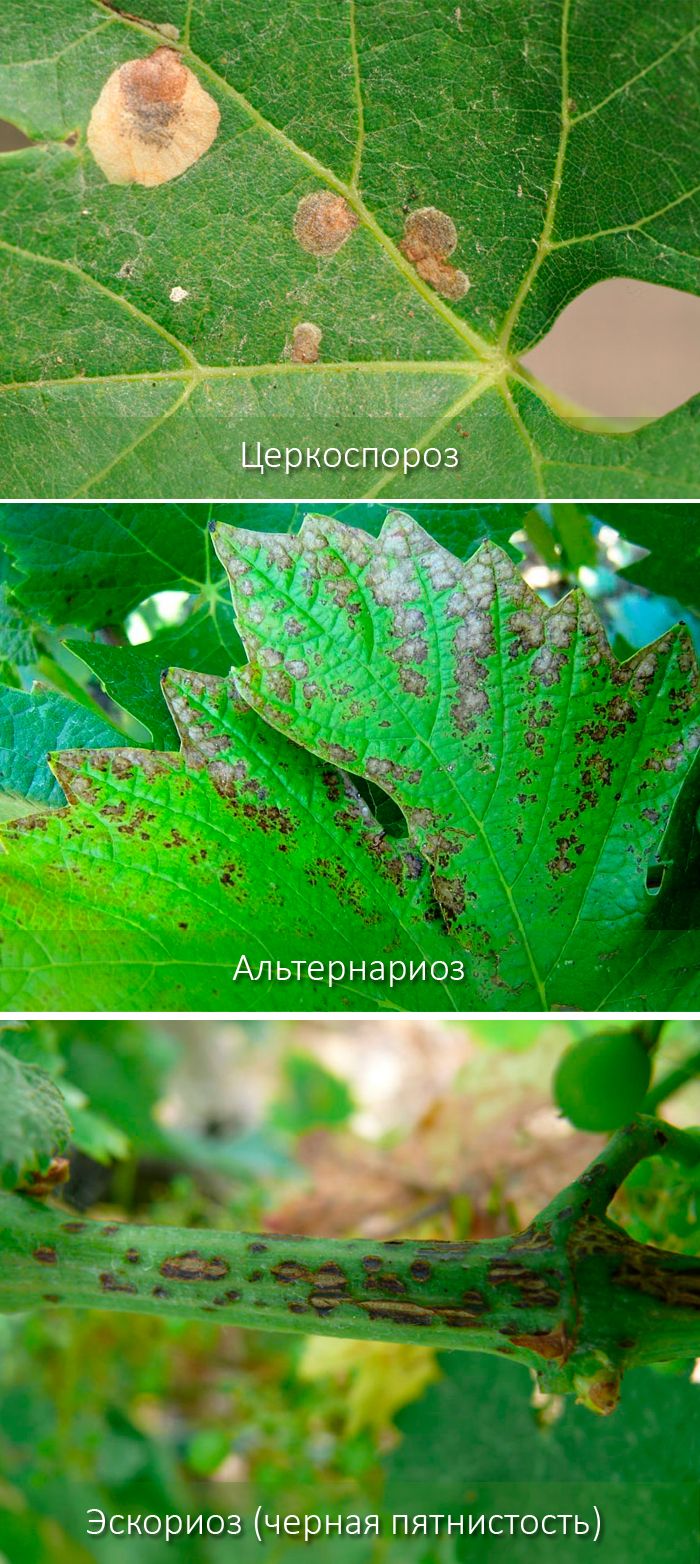 Черна петнистост (ескориоза) – тази гъба образува черни петна по цялото растение. Листата, плодовете и клоните почерняват. Заразените стъбла почерняват, изсъхват и падат, неспособни да поддържат грозда. За да се спаси растението, е необходимо подрязване и изгаряне на повредените клони. Растението може да се третира и с противогъбичния фунгицид Medea ME, което трябва да се направи в началото на пролетта, когато пъпките започнат да се отварят.