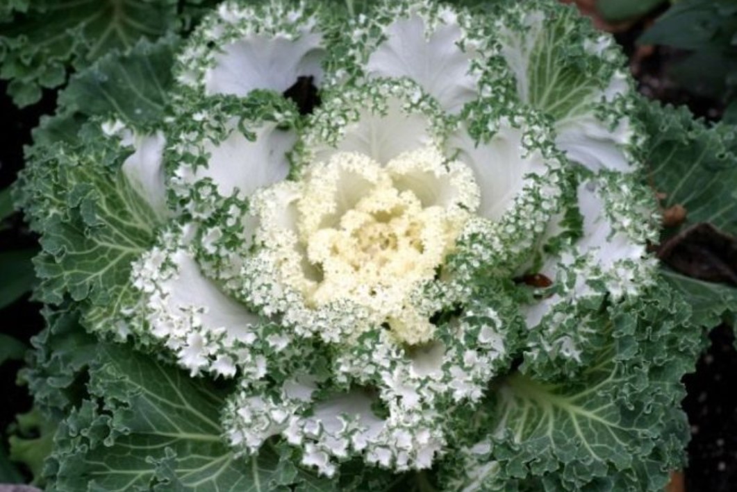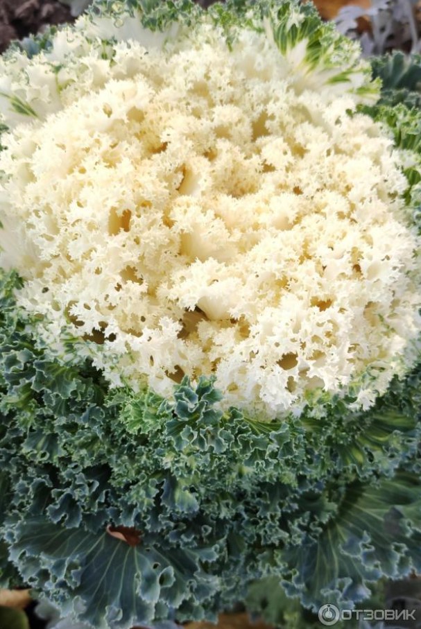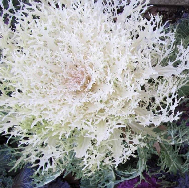 Центърът на растението, от друга страна, е бял с кремав оттенък. Листата в центъра са още по-плътни, изглеждащи като буйни къдрици.