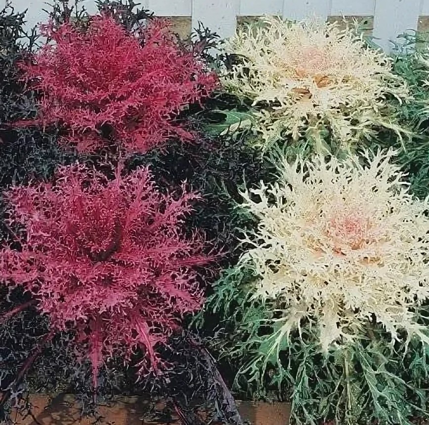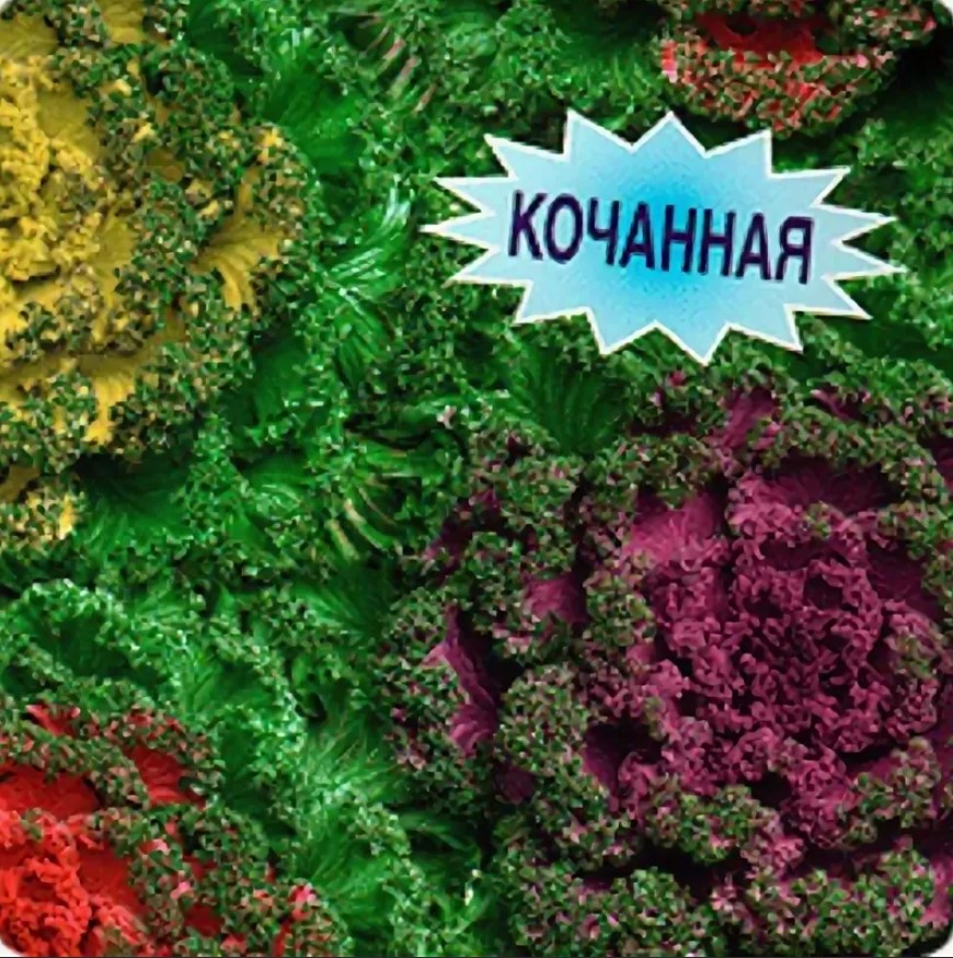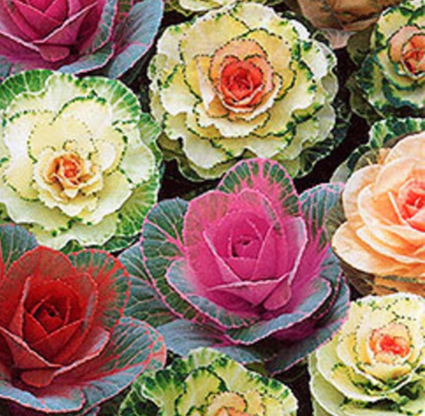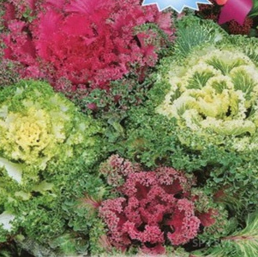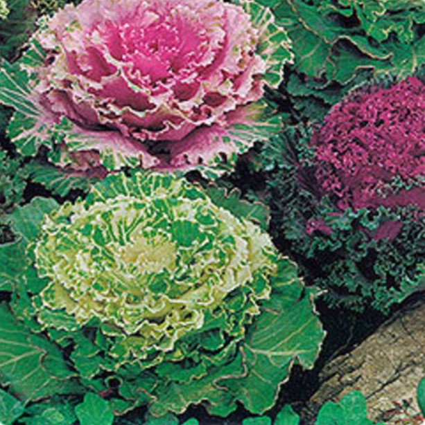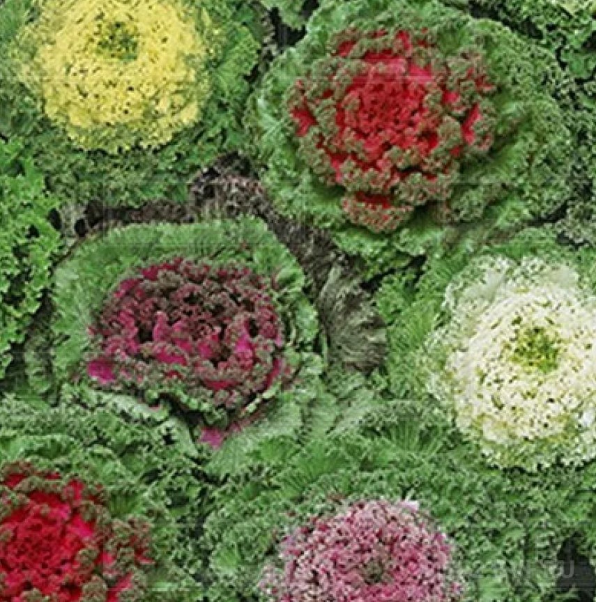35/30 | Гофрираните листа образуват гъста розетка. Те са двуцветни – външните листа са зелени, докато централните са снежнобяли, жълти, лилави, розови и червени, контрастиращи със зелените краища на листата. Същият сорт, но в различни цветове, се продава в една опаковка. | |
