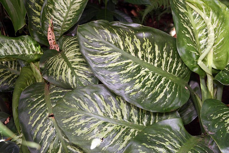 | Dieffenbachia amabilis (Seguina) | Сенкоустойчиво растение с голяма, буйна розетка от широки (до 18 см в диаметър) петнисти листа. За разлика от своите роднини, то понася по-добре сухия въздух и е неизискващо към микроклимата си. |