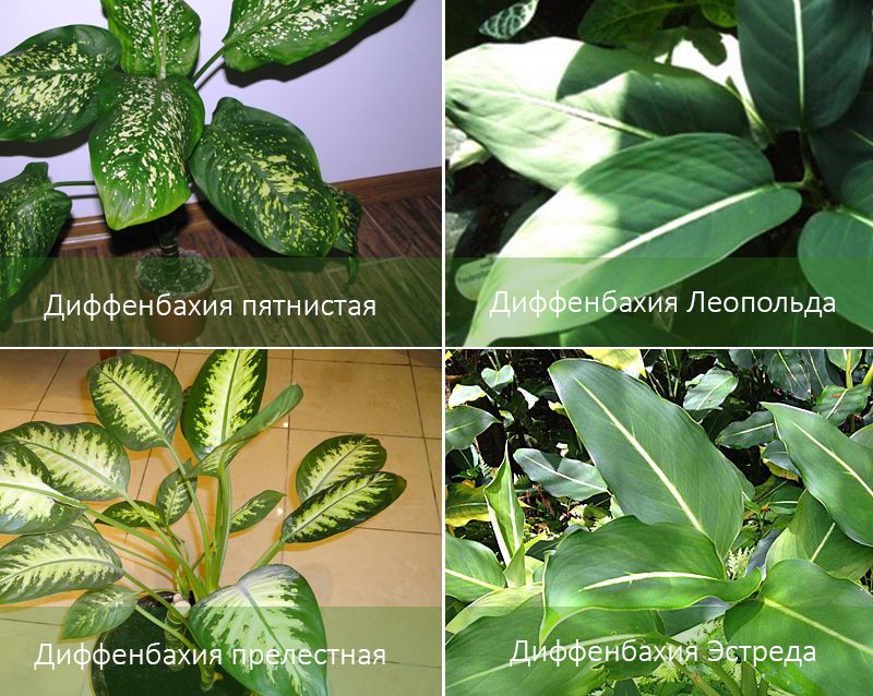 | Дифенбахия макулата (култивирани сортове: Камила, Тропик Сноу, Баузе) | Масивно растение с височина до един метър с широки, ланцетни листа. Характерното му оцветяване е тъмнозелено с контрастни светли петна, които могат да варират по размер от малки точки до големи жилки, покриващи почти цялата повърхност. |