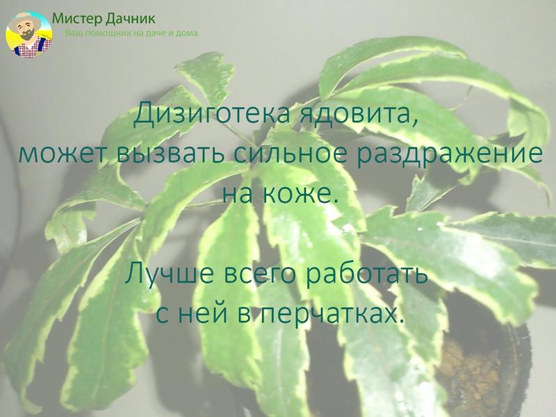 Дизиготеката е отровна и дразни кожата. Затова при работа с нея трябва да се носят ръкавици. Цветето обаче пречиства и овлажнява въздуха в дома, подобрявайки енергията.
