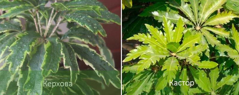 | Рициново | По-широкият от трите къси лоба, със заоблени зъби и жълти жилки. |