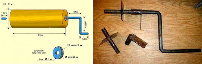 - Изработване на портата. За целта шлайфайте кръгла греда с диаметър 20 см и ширина 4-5 см по-малка от разстоянието между вертикалните стълбове. Направете отвори в нея от двете страни, с диаметър 2 см и дълбочина 5 см. Пробийте подобни отвори през стълбовете и поставете метални втулки. Окачете гредата на стоманени пръти с диаметър 24 мм. Огънете лявата под прав ъгъл, а дясната оставете каквато е. Това ще улесни събирането на вода. За да предотвратите изкривяването на портата, използвайте метална тел. Прикрепете верига, за да окачите контейнера за вода.