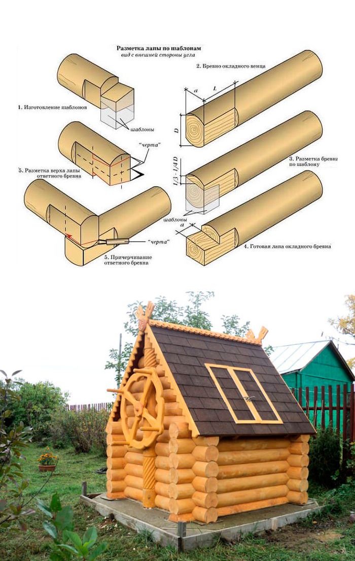 - Изградете рамката, използвайки заоблен дървен материал (10 см в диаметър). Сглобете ги напречно. Долните четири ще бъдат еднакви, а останалите ще бъдат с еднакво намаление (като кукла за гнездене).