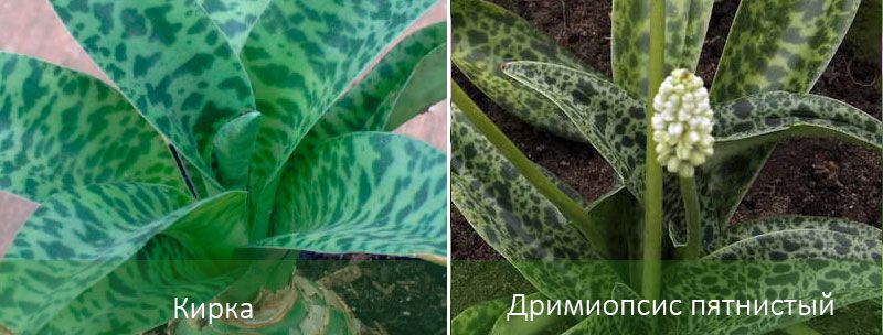 | Дримиопсис макулата | Луковицата е удължена и тъмнозелена. Листата са сърцевидни и овални, зелени, с гофрирани ръбове. Дръжката е дълга, достигаща 15 см. Цветовете са дребни, сиви, бежови, жълти и бели. Съцветието е гроздовидно. Цъфтежът е от април до юли. |