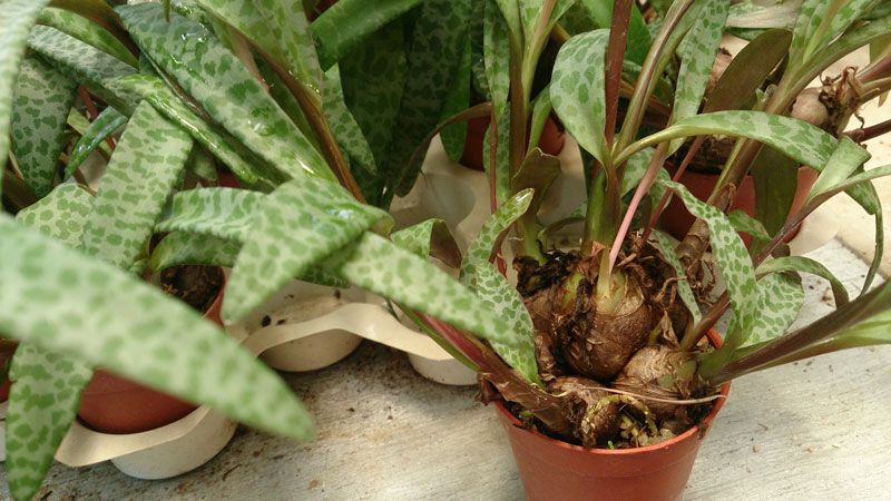 - Дримиопсисът се изважда внимателно от стария си контейнер и излишната почва се отстранява от луковиците. Издънките се отделят, но това трябва да се направи внимателно, за да се сведат до минимум повредите.