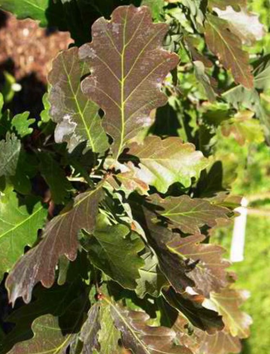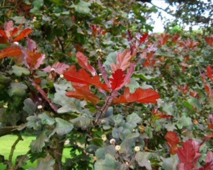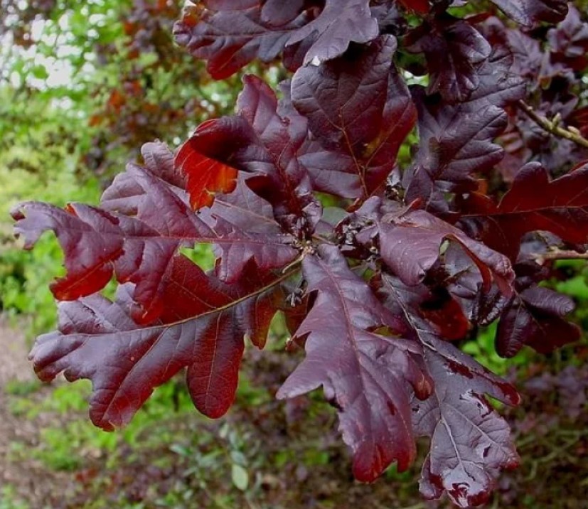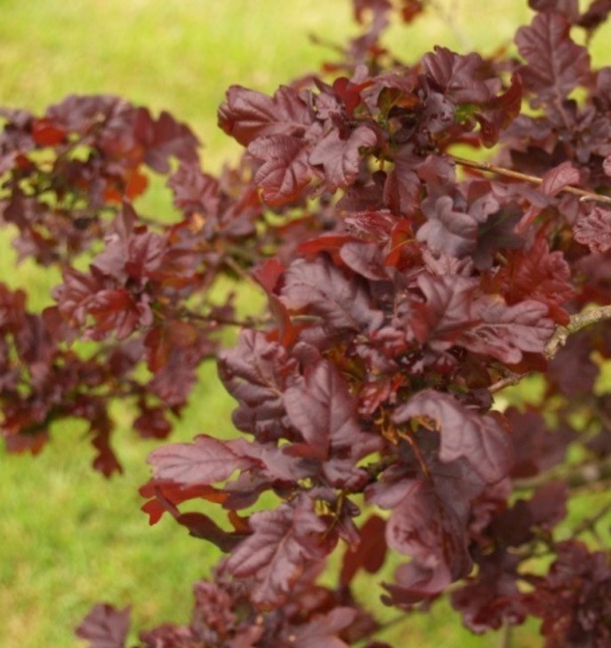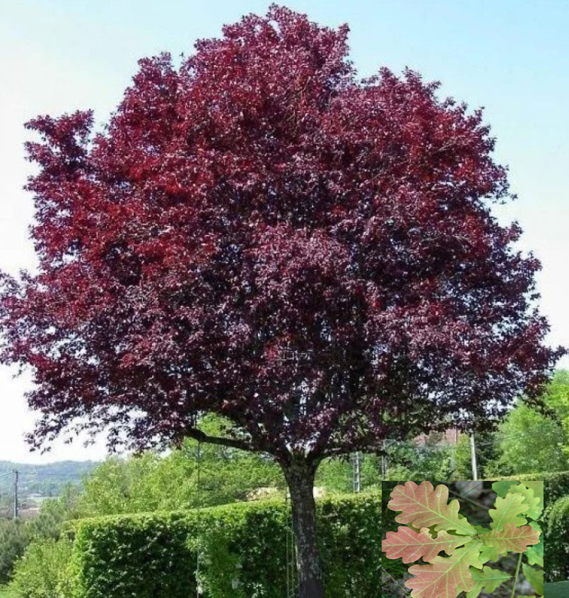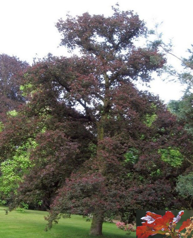 | Ален дъб, дъб Кокинея | Външен вид: Широколистно дърво с корона, която започва като конус и постепенно става закръглена. Диаметърът на ствола на височина на гърдите обикновено варира от 60 до 90 см. Кора: Светло сиво-кафяво, фино напукнато. Клоните имат червеникаво-кафяв оттенък. Издънките първоначално са сиво-кафяви и опушени, но по-късно оголват. Листа: Дълги от 8 до 15 см и широки от 6 до 12 см, те са широко обратнояйцевидни или елиптични, със заострен връх и отрязана или клиновидна основа. През есента стават пурпурночервени. Плодове: Жълъдите са яйцевидни или почти кълбовидни, дълги от 1,5 до 2,5 см, с тънка, червеникавокафява обвивка. Купулата е обратноконична, покриваща от една трета до половината от дължината на жълъда. Цъфтеж и плододаване: Цъфтежът настъпва едновременно с разгръщането на листата през май, а плододаването започва през септември. Зона на разпространение: Расте в източната част на Съединените щати и южната част на Канада. Интересни факти: Сортът Splendens спечели наградата за заслуги в градината на Кралското градинарско дружество. |