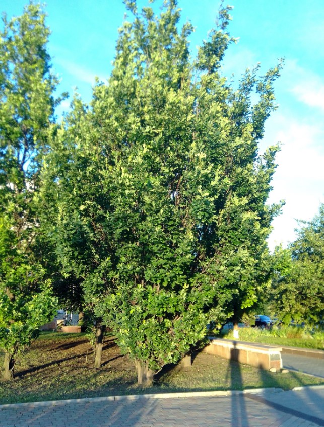 | Ориенталски дъб, кавказки високопланински дъб | Външен вид: Достига 25 метра височина. Короната е разперена и буйна. Кората на младите издънки е кадифена, по-късно става гладка и дебела. Пъпките са яйцевидни, с малко люспи. Листа: Редуващи се, обратнояйцевидни. 6-18 см дълги, 5-10 см широки. 7-11 заоблени дяла по ръба. Отгоре тъмнозелени и лъскави, отдолу сиво-опушени. През есента пожълтяват или стават жълто-кафяви. Блум: Май. Мъжки реси, дълги и многобройни, висят от клоните. Не цъфти в Москва. Плодове: Жълъдите са дълги 2 см, наполовина покрити от чашката. Събрани са в групи от 2-4. Разпространение: Склонове на Кавказките планини, Армения, Северен Иран. Статус: Рядък и ценен вид. Вписан в Червената книга на Краснодарския край. РастежВирее на топло, изисква защитено място и е устойчив на суша. Може да бъде повреден от късни слани, така че е най-добре да се засажда в по-топъл климат. |