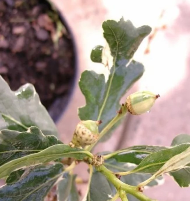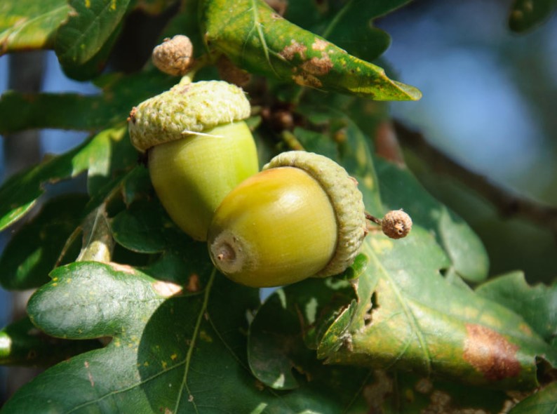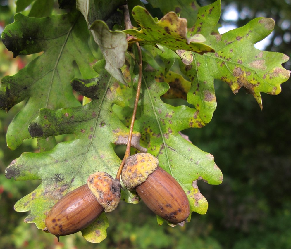 Жълъди: Ядките са с овална форма и покрити с жълто-кафява черупка.