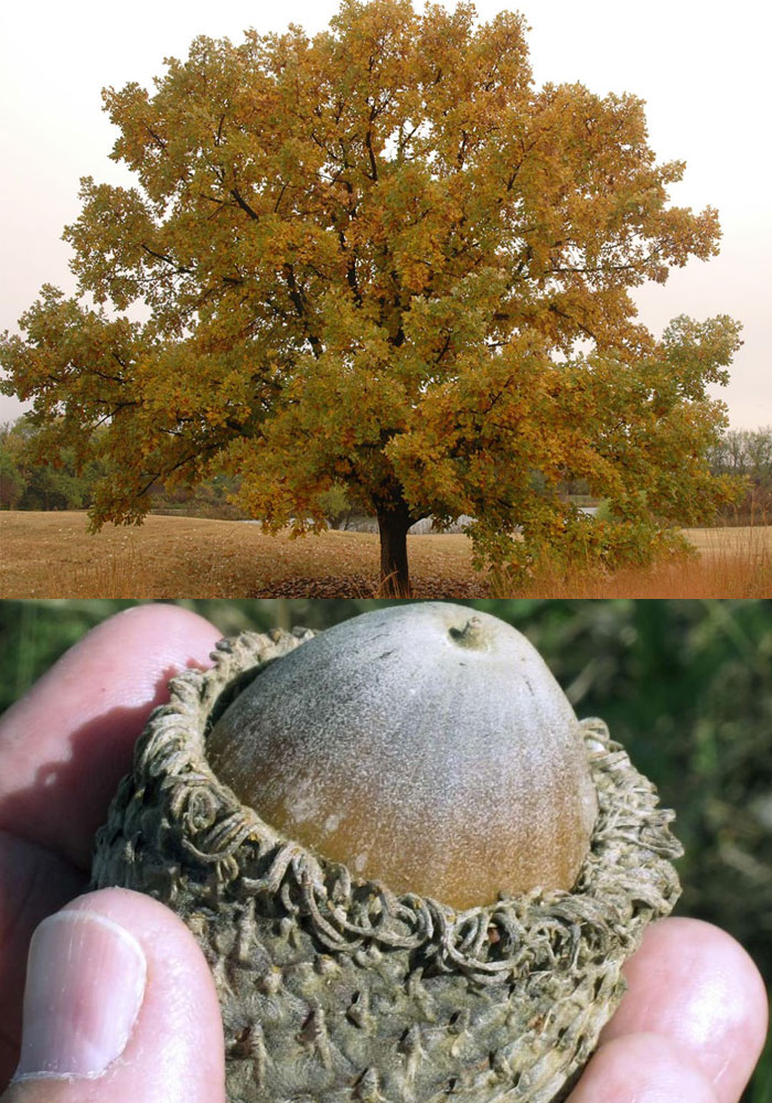 | Не е така. | Външен вид: Има гъста, палаткообразна и разперена корона. Кората е светла, сиво-кафява, напукната и дълбоко набраздена. Клоните са кафяви, а леторастите са опушени и имат жълто-оранжев оттенък. Листа: Листата са разположени на дръжки с дължина приблизително 2 см. Те са последователни, удължено-яйцевидни, с клиновидна основа и дълбоко нарязани ръбове. През лятото са покрити със сребрист пух, който по-късно изчезва, оставяйки лъскава тъмнозелена повърхност отгоре и фино опушена, белезникавозелена отдолу. През есента придобиват жълто-кафяв оттенък. Плодове: Жълъдите обикновено са единични, приседнали или на малка дръжка. Те са големи, овални, дълги до 5 см, като около една трета са покрити с дълбоко чашковидна купула. Зона на разпространение: Родина - Северна Америка. |