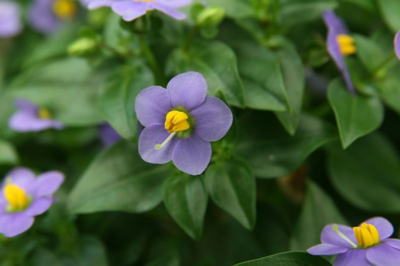 Свързаният Exacum има хибриди: синьо джудже, сини очи, бяла звезда.