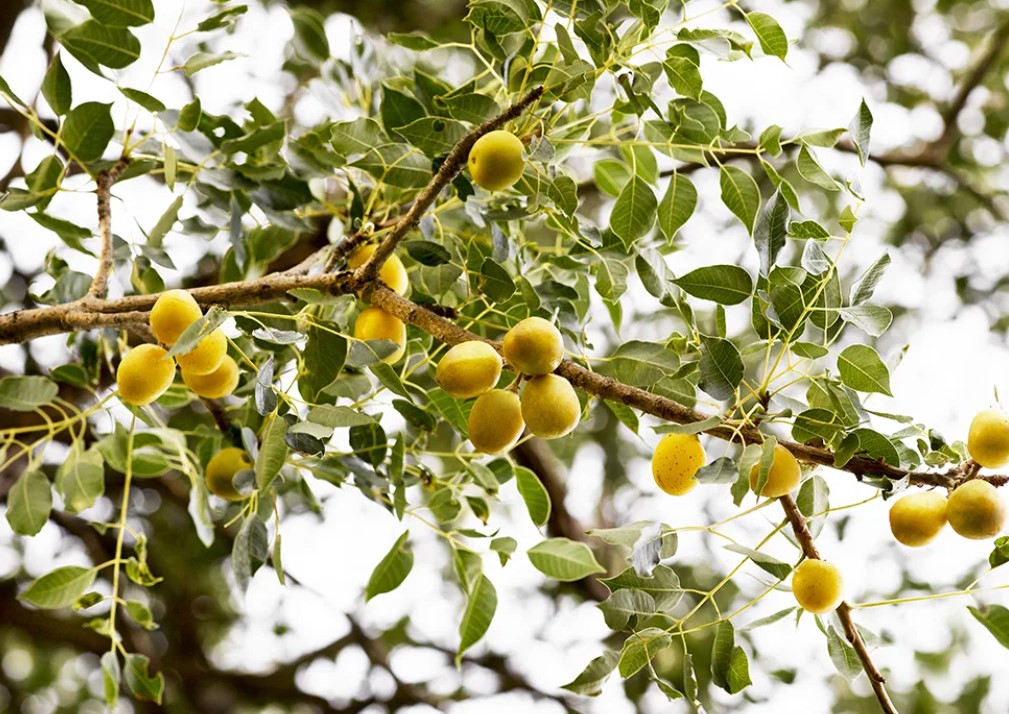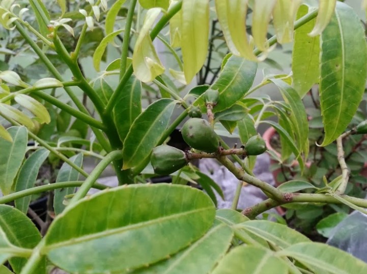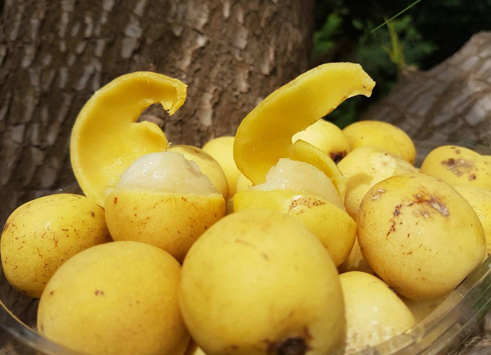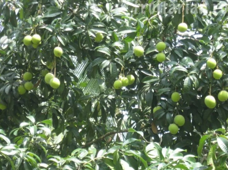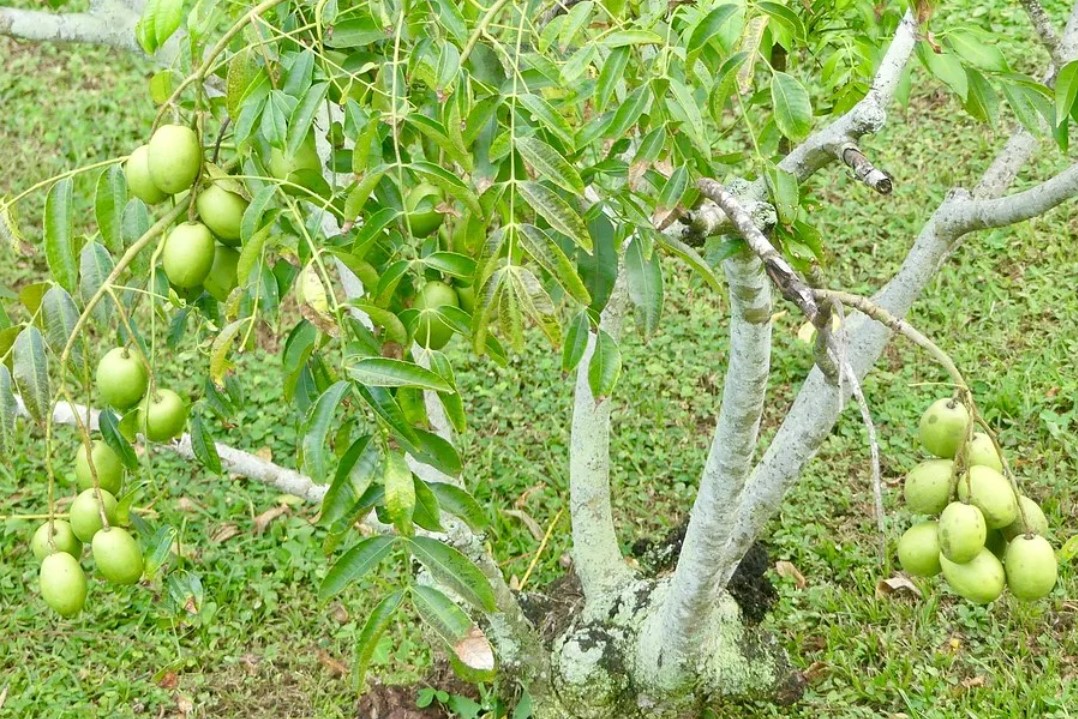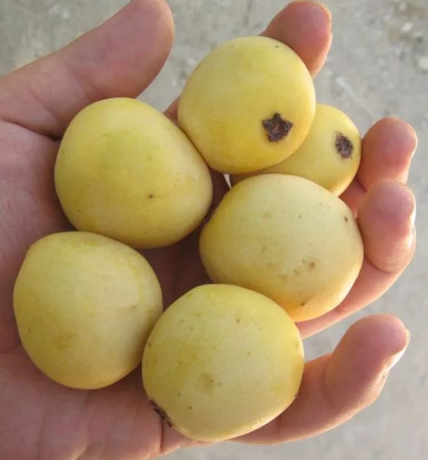 | Описание | Овалните плодове имат златист блясък. Те растат на гроздове и имат тънка, здрава кора. Вътре има жълтеникава плът, обграждаща твърда, шиповидна костилка. |