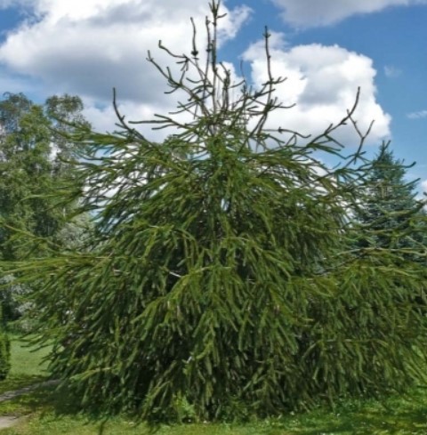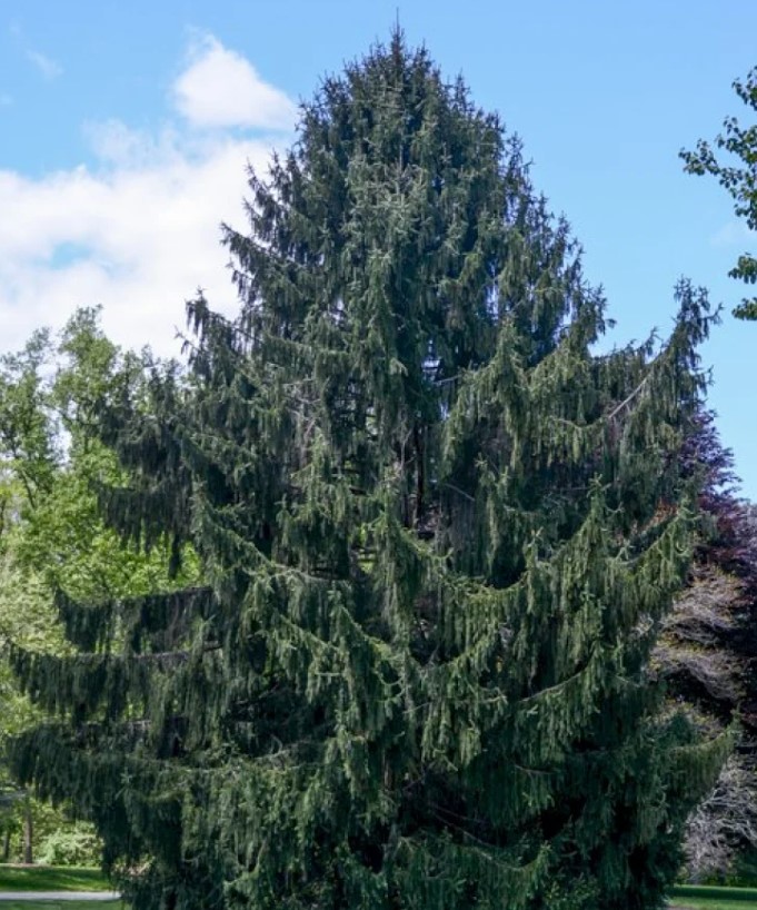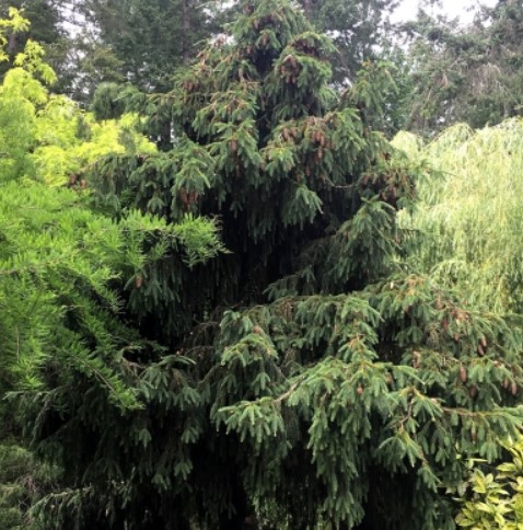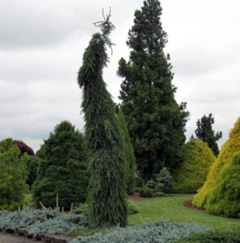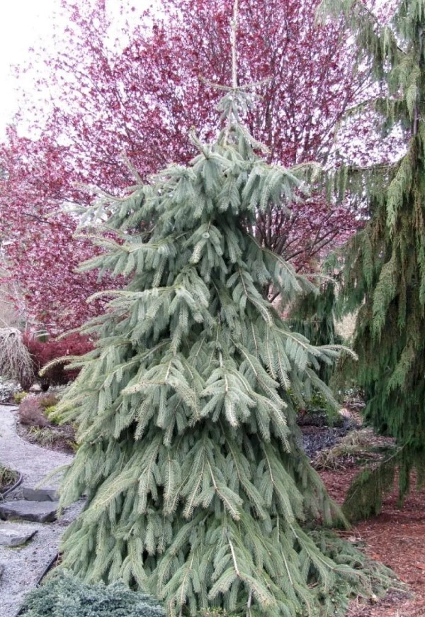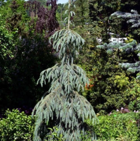 Това дърво има необичайни синьо-зелени иглички. Расте до 40 м, а стволът му може да достигне диаметър от 150 см. Има конична корона, украсена с плачещи клони. Младите издънки на това дърво са червеникаво-кафяви, по-късно стават сребристо-сиви. Кората е сиво-кафява. Пъпките са заоблени, дълги от 5 до 7 мм. Игличките са тъмнозелени отгоре и матово сиви отдолу. Достигат дължина от 16 до 35 мм. Шишарките са цилиндрични, дълги от 6,5 до 12 см. Първоначално са червеникаво-розови, а когато узреят, придобиват червеникаво-кафяв цвят. Живее до 900 години. Плачещи клони се образуват едва след 10-20 години. Преди този момент дървото може да бъде объркано със сръбския смърч.