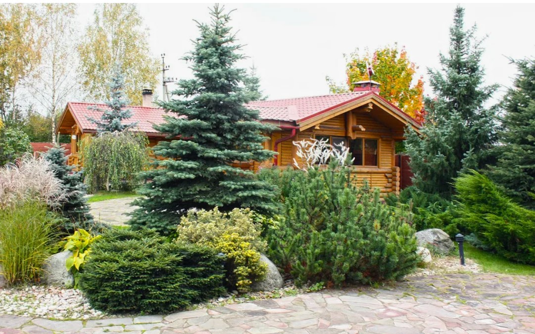 Съчетава се добре със зелени смърчови дървета. Изглежда ефектно и със зелени туи и на фона на зелена морава. |