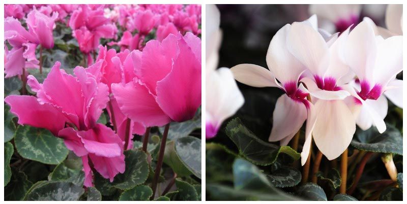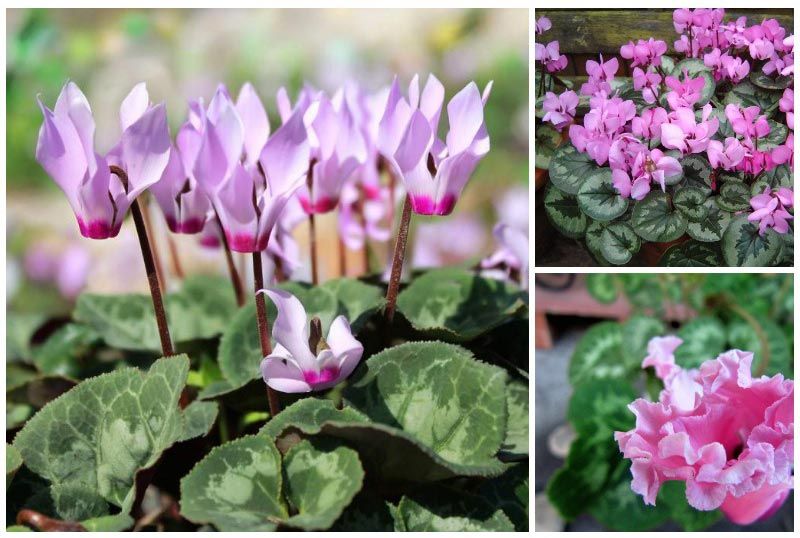 | Περσικό κυκλάμινο | Πολυετές φυτό, ύψους έως 30 εκ., με στρογγυλό, σαρκώδες ριζικό σύστημα, διαμέτρου 15 εκ. Δεν σχηματίζει θυγατρικούς βλαστούς. | Μεγάλα, με διάμετρο έως 14 cm, αναπτύσσονται από κόνδυλο, σε σχήμα καρδιάς, σκούρο πράσινο με ανοιχτόχρωμο μοτίβο, οι μίσχοι είναι κόκκινο-καφέ. | Έχουν πέντε μυτερά, καμπύλα πέταλα, μήκους έως 5 εκ. Μια πλούσια γκάμα χρωμάτων: λευκό, ροζ, μπορντό, μοβ, σκούρο κόκκινο. |