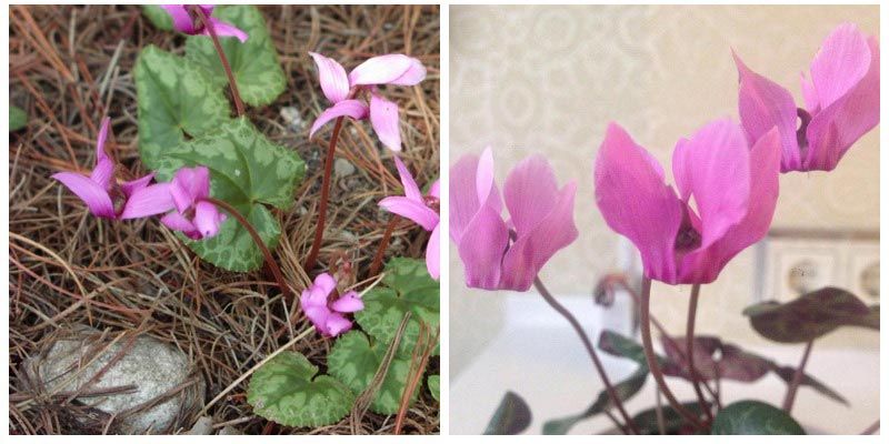 | Κυκλάμινο purpurea (Ευρωπαϊκό) | Ένα χαμηλό φυτό, ύψους 10-20 εκ. Οι μικροί κόνδυλοι είναι τυλιγμένοι με βλαστούς ριζών. | Μικρό—2-4 εκ., στρογγυλεμένο. Η πάνω πλευρά του φύλλου είναι πράσινη με ασημί σημάδι, η κάτω πλευρά είναι σκούρο κόκκινο. | Αποτελούνται από πέντε πεσμένα πέταλα ροζ, βαθύ πορφυρό ή μοβ. Τα κοτσάνια των λουλουδιών έχουν χρώμα κερασιού. |