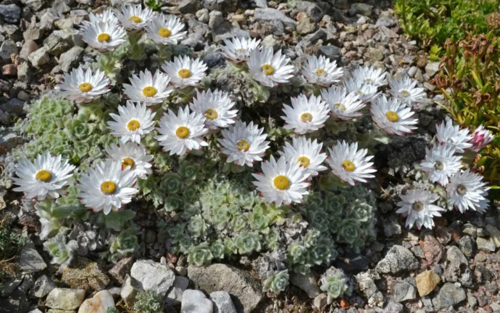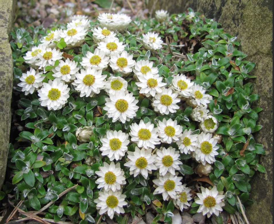| Περιγραφή | Όταν είναι νεαρό, το στέλεχος είναι ελαφρώς εφηβικό. Αργότερα, γίνεται λείο και κοκκινωπό-καφέ. Φτάνει τα 15 cm σε ύψος και τα 60 cm σε πλάτος. Τα φύλλα είναι αντωοειδή, μήκους όχι μεγαλύτερου από 10 mm. Οι ταξιανθίες είναι κεφαλοειδείς, περιφέρειας έως 30 mm, χιονόλευκες, μοναχικές και μοιάζουν με μαργαρίτες. |