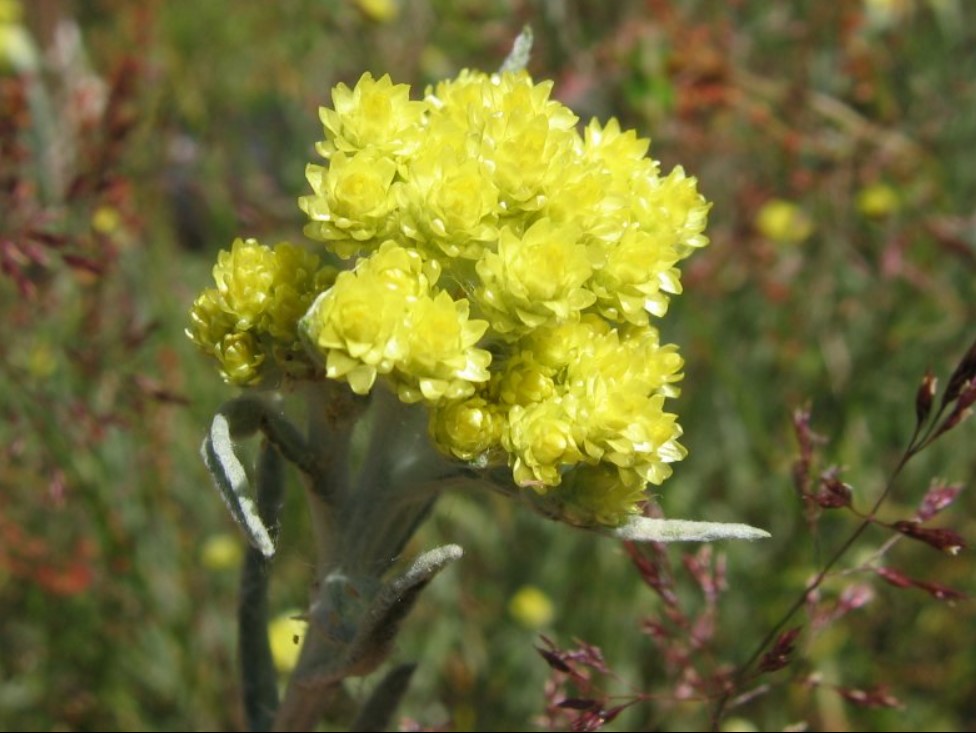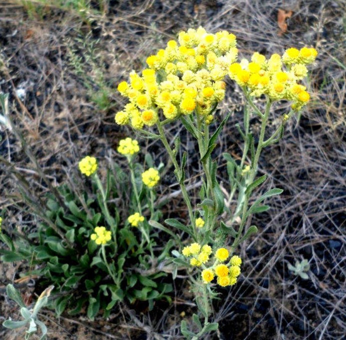 | Περιγραφή | Το ρίζωμα είναι ξυλώδες και σκούρο καφέ. Από αυτό αναπτύσσονται άκλαδοι μίσχοι, φτάνοντας σε ύψος 15-30 cm, μερικές φορές φτάνοντας έως και 60 cm. Εάν εμφανιστούν πλευρικοί βλαστοί, δεν θα καρποφορήσουν. Τα κορυφαία φύλλα είναι εναλλασσόμενα, μήκους έως 60 mm. Τα βασικά φύλλα είναι σπαθοειδή-γραμμικά ή αντωοειδή. Τα μεσαία και άνω φύλλα είναι άμισχα, γραμμικά ή γραμμικά-λογχοειδή. Το φυτό έχει μια ασημένια λάμψη λόγω της λευκής, τσόχινης εφηβείας στα φύλλα και τους μίσχους. Στην κορυφή υπάρχουν σφαιρικές κίτρινες, ή περιστασιακά πορτοκαλί, ταξιανθίες, ομαδοποιημένες σε κορυμβώδεις φόβες των 10-30. Τα βράκτια έχουν χρώμα που κυμαίνεται από έντονο κίτρινο έως κοκκινωπό και είναι είτε άκαμπτα είτε θρόισμα. Μετά την ανθοφορία, σχηματίζονται δρύπες. |