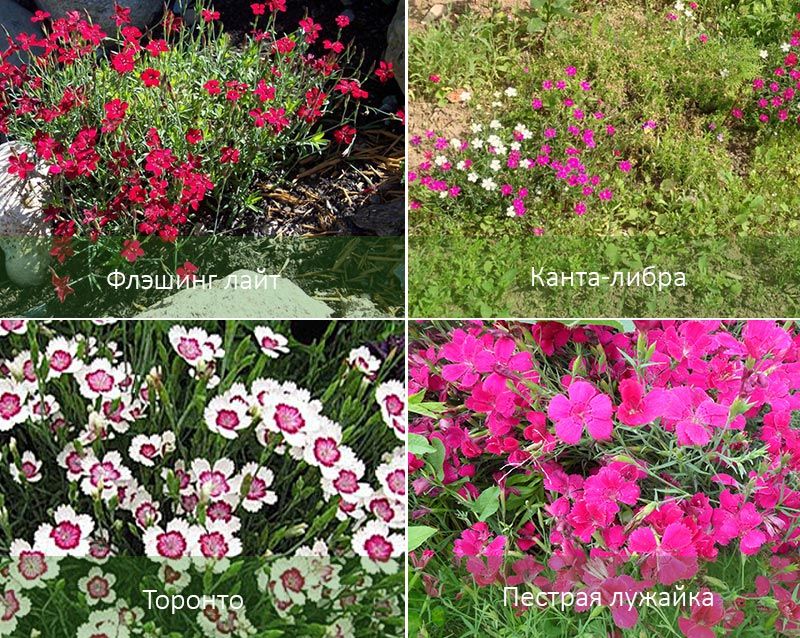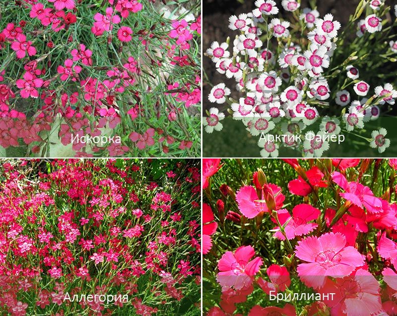 | Αρκτική Φωτιά | 20-25. | Είναι ενός έτους. Αγαπά το φως, είναι ανθεκτικό στην ξηρασία και ανέχεται καλά τους σοβαρούς παγετούς. Αυτή η ποικιλία Dianthus herbaceus χρησιμοποιείται συχνά στον σχεδιασμό τοπίου, φυτεμένη κάτω από κωνοφόρα. |