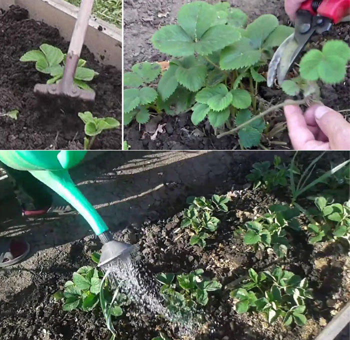 Σε μια φυτεία φράουλας, το έδαφος πρέπει να χαλαρώσει και να ποτιστεί, και να γονιμοποιηθεί.