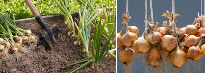 Εάν οι κορυφές σκιστούν κατά τη συγκομιδή, αλλά το υπόγειο τμήμα παραμένει στο έδαφος, είναι καλύτερο να τις σκάψετε με τσουγκράνα αντί για φτυάρι για να μην τις καταστρέψετε. Μετά τη συγκομιδή, οι βολβοί πρέπει να στεγνώσουν στον αέρα, αλλά σε σκιερό μέρος για να αποφύγετε τα ηλιακά εγκαύματα. Αφού εξατμιστεί η υγρασία, συνιστάται να κλαδεύετε τις κορυφές.